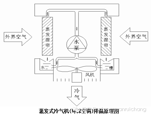 蒸發(fā)式冷氣機(jī)降溫原理可參照下圖,機(jī)組工作時(shí),首先是由水泵把底盤中的水抽上來,然后由布水管均勻的把水分布到蒸發(fā)濕簾頂部。水隨即淋濕整個(gè)蒸發(fā)濕簾的接觸面積,最后回到底盤。當(dāng)風(fēng)機(jī)工作時(shí),外面的新鮮空氣被迫從蒸發(fā)濕簾中經(jīng)過,濕簾表面的水蒸發(fā)吸收空氣中的熱量。此時(shí)從風(fēng)機(jī)送出來的空氣,就是經(jīng)過降溫處理過的新鮮冷氣。