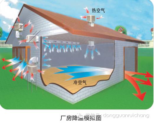 過去是采用自然風(fēng),以熱壓與風(fēng)壓原理通過排氣孔、天窗進(jìn)行通風(fēng)換氣,也有在屋頂裝排氣風(fēng)帽來達(dá)到上述目的,但其效果顯然不佳。從圖中可以看出,室外新鮮空氣經(jīng)過蒸發(fā)式冷氣機(jī)的過濾、降溫后,通過風(fēng)管,或者直接通過風(fēng)口,源源不斷送到室內(nèi)各個(gè)角落,由于系統(tǒng)采用了大量的新風(fēng),使室內(nèi)處于正壓狀態(tài),從而可以把室內(nèi)帶有異味、粉塵、混濁悶熱的空氣排出,最終達(dá)到降溫?fù)Q氣的目的。